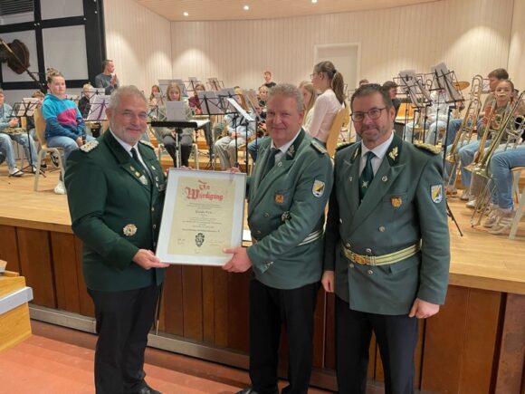 Kreisoberst Thomas Reiss zeichnete Guido Veit mit dem Orden für hervorragende Verdienste aus. Eine seltene und besondere Anerkennung. In seiner Laudatio würdigte er Guidos langjähriges Engagement rund um das Schützenfest, die Schützenhalle und die gesamte Bruderschaft.